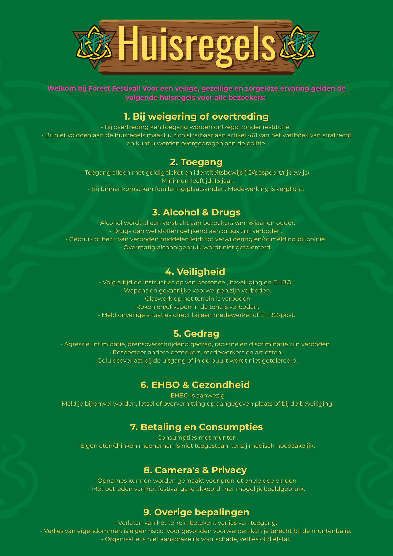 Om er voor te zorgen dat iedereen een gezellige én veilige avond beleeft, hebben we een aantal huisregels opgesteld. Je vind ze ook bij de entree van het festivalterrein. Zo weten we allemaal waar we aan toe zijn en kunnen we er 12 en 13 september een mooi feestje van maken! 💛